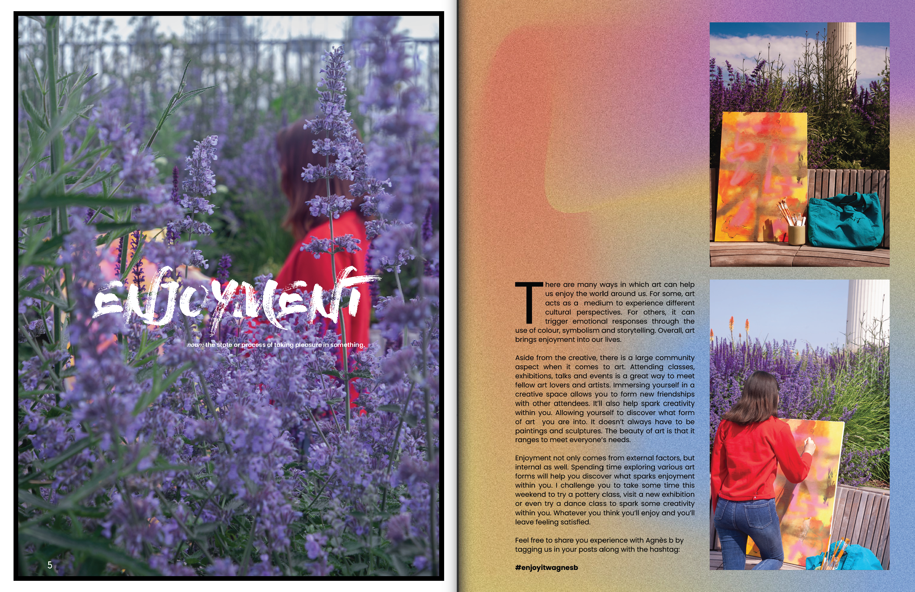 Agnès B is a renowned French fashion brand, best known for its iconic snap cardigan. This campaign was part of a Master’s project centered around the concept of Holistic Hedonism, which emphasizes the pursuit of one’s passions. The campaign included a video, a photoshoot, and a brand zine, all working together to convey this philosophy.